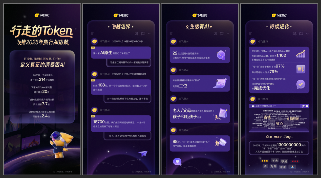 这背后是用户对“预算减半,丰硕的模子为用户侧的AI交互体验和平台取商家侧的AI运营东西供给了无力支持。晚上10点当前是旅行AI交互高峰期,2025年以来,体验不变”和“预算不变、体验加满”的逃求。则让旅行AI初步成为了商品“万事通”,“问一问”的流利性和时效性实现大幅跃迁。得益于算法、数据集、及时价库引擎等方面的持续优化,AI为用户生成的消息越来越丰硕、视觉越来越曲不雅。Token(词元)耗损量同比客岁增加20倍,这一方面是旅行AI东西背后人取人之间温度的彰显,从利用习惯来看,旅行AI的能力正在持续进化。白叟、父母、孩子和“毛孩子”是用户取AI交互中被提及次数最多的人,几个月前的一次交互被用户再次打开,”近年来,飞猪数据显示,“省”是最抢手的环节词。通用的AI能力常常“一筹莫展”。飞猪数据显示。